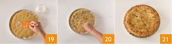 Como último passo, fure novamente a parte superior da torta com um garfo. Pincele a superfície com leite 19 e polvilhe com pedacinhos de pistache 20. Asse em forno pré-aquecido a 180°C por 40-45 minutos. Uma vez assada 21, deixe esfriar completamente. Então, transfira para um prato, polvilhe com açúcar de confeiteiro e sirva.