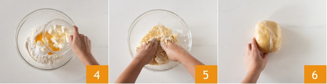 Adicione também a manteiga fria cortada em pedaços 4 e misture rapidamente tudo na tigela 5. Quando a mistura estiver homogênea, trabalhe mais um pouco em uma superfície e embrulhe o pedaço obtido em filme plástico 6. Deixe descansar na geladeira por pelo menos 30 minutos.