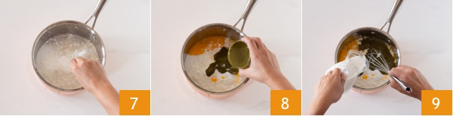 Enquanto isso, prepare o creme de confeiteiro com pistache. Em uma panela, coloque o amido, o açúcar e o sal 7; adicione também as gemas e a pasta de pistache 8. Nesse ponto, mexendo com um batedor, adicione o leite aos poucos 9.