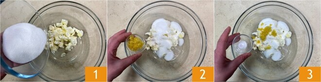 Para preparar a torta de amora com ganache branca, comece pela massa: coloque em uma tigela a manteiga, o açúcar 1, as raspas de limão 2 e o sal 3, depois misture com as mãos até que o açúcar seja absorvido.