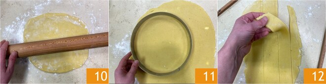 Após o tempo de resfriamento, enfarinhe levemente a massa e abra-a até obter uma espessura de 3 mm 10. Corte um disco com diâmetro de 24 cm 11 e faça tiras com largura de 3 cm 12.