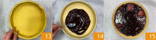 Use o disco e as tiras para forrar, respectivamente, a base e as bordas de uma forma do mesmo tamanho (diâmetro 24 cm, altura 3 cm), depois elimine o excesso de massa 13. Espalhe uma camada de geleia de amora na base, tomando cuidado para não sujar as bordas 14. Asse em forno estático pré-aquecido a 175ºC por cerca de 20 minutos. Quando a massa estiver dourada, retire do forno e deixe esfriar 15.