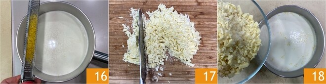 Enquanto isso, prepare a ganache: coloque em uma panela o creme de leite e as raspas de limão 16. Enquanto isso, pique o chocolate branco com uma faca 17. Quando o creme de leite começar a ferver, retire a panela do fogo e adicione o chocolate branco picado 18.