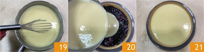 Misture bem com um batedor de arame para derretê-lo completamente 19. Pegue a torta novamente e despeje a ganache sobre a camada de geleia 20, depois coloque na geladeira por uma hora ou no freezer por 15-20 minutos 21.