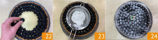 Após o tempo de endurecimento, decore a torta dispondo as amoras frescas em círculos concêntricos até cobrir toda a ganache 22, depois polvilhe com açúcar de confeiteiro 23. Sua torta de amora com ganache branca está pronta para ser servida 24!