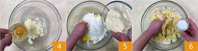 Neste ponto, adicione o ovo 4 e amasse novamente para incorporá-lo. Junte a farinha de trigo e a farinha de amêndoas 5 e continue amassando, depois adicione também o fermento 6.
