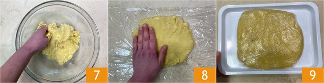 Amassar na tigela para incorporar os ingredientes secos de forma uniforme 7, depois transfira a mistura para um filme plástico e achate-a para formar um bloco 8. Embrulhe a massa no filme plástico e deixe descansar na geladeira por cerca de uma hora 9.