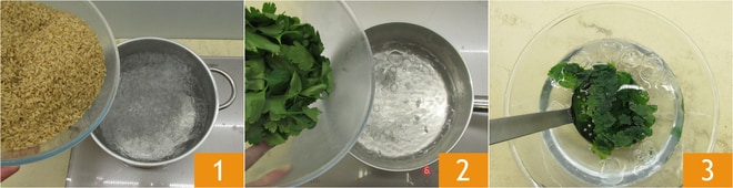 Para preparar a Torta de arroz com ervilhas, aspargos e abobrinhas, ferva em água salgada o arroz integral 1, seguindo os tempos de cozimento indicados na embalagem. Enquanto isso, em outra panela, branqueie a salsinha por 20 segundos 2 e depois escorra em uma tigela com água e gelo 3.