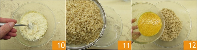 Adicione também o queijo parmesão ralado 10 e misture para incorporar. Escorra o arroz em uma tigela 11 e deixe esfriar por alguns minutos, depois adicione a mistura de ovos 12 e misture bem.