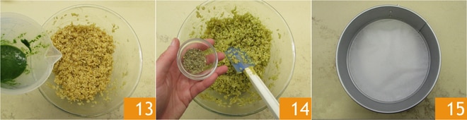 Adicione também metade do óleo de salsinha 13 e manjerona seca 14. Forre com papel manteiga o fundo de uma forma de aro removível de 19 cm de diâmetro 15.