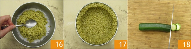 Espalhe a massa na forma 16, compacte bem, com a ajuda de uma colher, a base, depois distribua a massa nas bordas. Quanto mais pressionado o arroz estiver contra as laterais da forma, mais seguros estaremos de sua estabilidade durante o cozimento 17. Asse em forno estático pré-aquecido a 180 graus por 30 minutos. Corte as abobrinhas em rodelas 18.