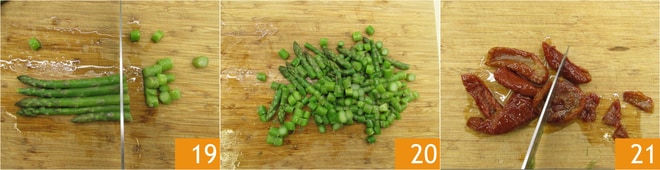Limpe os aspargos e corte-os em rodelas de 1 cm 19, deixando as pontas inteiras 20. Pique finamente os tomates secos escorridos do óleo de conservação 21.