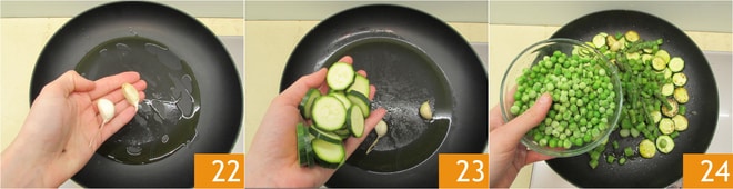 Em uma frigideira, coloque um fio de óleo e dois dentes de alho com casca 22, doure em fogo médio por alguns minutos. Coloque as abobrinhas na frigideira 23, adicione também os aspargos e as ervilhas 24 e cozinhe por 10 minutos, mexendo de vez em quando, até que os legumes fiquem bem dourados.