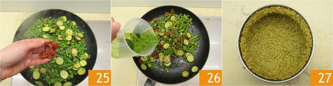 Adicione também os tomates 25. Quando os legumes estiverem cozidos mas ainda crocantes, apague o fogo, retire o alho, ajuste o sal, se necessário, e tempere com o óleo de salsinha restante, misture e reserve. Quando a base estiver assada, retire do forno 27 e deixe esfriar.