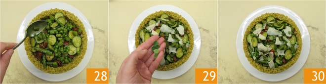 Transfira a torta para um prato de servir. Recheie com os legumes 28 e, por último, guarneça com lascas de parmesão e folhas de hortelã 29. A Torta de arroz com ervilhas, aspargos e abobrinhas está pronta para ser servida 30.