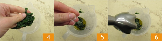 Esprema e coloque em um copo alto 4, adicione o óleo e uma pitada de sal 5, bata com um mixer de mão 6.