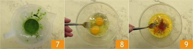Você deve obter um molho bem verde 7. Em uma tigela, misture com um garfo os ovos 8, uma pitada de cominho, uma pitada de páprica picante, uma pitada de sal e pimenta 9.
