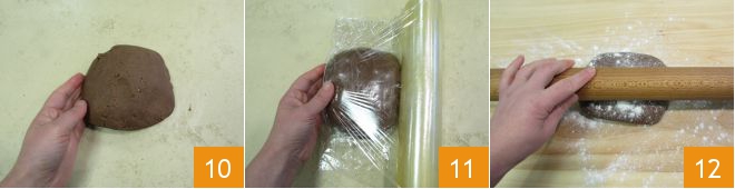 e alise formando um bloco 10. Enrole o bloco em filme plástico e coloque para descansar na geladeira por uma hora 11. Passado o tempo, recupere a massa, tire o filme plástico e estenda a massa sobre uma superfície ligeiramente enfarinhada. Ajude-se com o rolo de massa 12