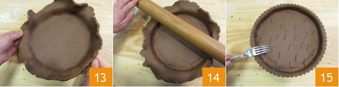 para obter um disco com cerca de 6 mm de espessura e grande o suficiente para forrar uma forma com disco removível de 23 cm 13. Em seguida, elimine os excessos pressionando o rolo ao longo das bordas da forma 14 e fure a base com os dentes de um garfo 15.