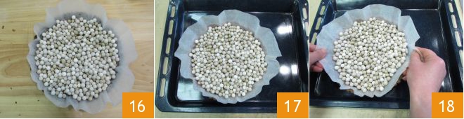 Coloque sobre a massa um papel manteiga e dentro pesinhos ou leguminosas secas 16 e asse em forno pré-aquecido por 30 minutos a 180° 17, depois elimine o papel manteiga com os pesinhos e continue assando por mais 10 minutos 18.