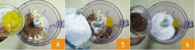 Para preparar a torta de avelãs com ganache de chocolate amargo e cerejas, comece pela Massa podre de cacau e avelãs. No processador, coloque todos os ingredientes. Comece com farinha e manteiga 1, farinha de avelã 2, cacau em pó 3