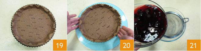 Uma vez que a base esteja assada, deixe esfriar completamente 19 antes de transferi-la para o prato de servir 20. Enquanto isso, cuide do restante. Escorra as cerejas, recolhendo 100 g de calda em uma tigelinha 21