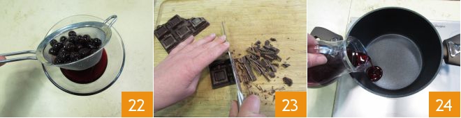 então transfira as cerejas escorridas 22 e pique o chocolate para fazer a ganache 23. Em uma panelinha, coloque a calda de cerejas 24,