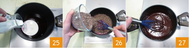 a nata 25 e aqueça até quase ferver. Então desligue o fogo e adicione imediatamente o chocolate enquanto mexe com um batedor 26. Assim, o chocolate irá derreter com a temperatura ainda muito quente 27.