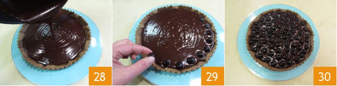 Despeje a ganache sobre a massa que você já terá transferido para o prato de servir, decore com as cerejas e deixe firmar na geladeira por 6-8 horas 29. Após o tempo necessário para que tudo se compacte, sua torta de avelãs com ganache de chocolate amargo e cerejas estará pronta para ser degustada 30.