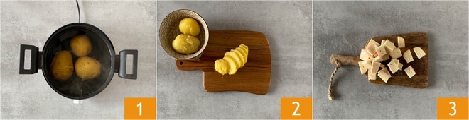 Para preparar a torta de batata com speck e taleggio, cozinhe as batatas em bastante água 1, escorra e descasque-as ainda quentes. Corte-as em fatias de cerca de meio centímetro de espessura 2. Corte também o taleggio em fatias e depois em pedaços 3.