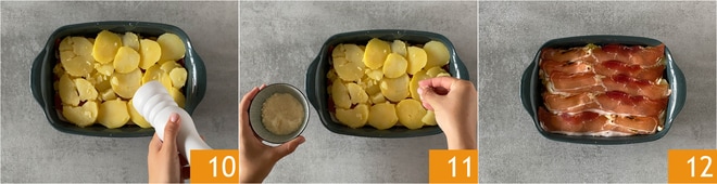Continue com mais uma camada de batatas, salgue, tempere com o Grana Padano 11, o speck 12 e mais taleggio.