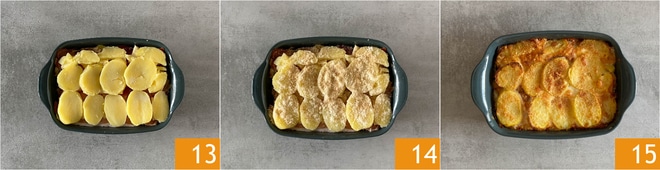 Por fim, na última camada de batatas 13, adicione o Grana Padano e a farinha de rosca 14. Cozinhe em forno pré-aquecido em modo ventilado a 200° por cerca de 25 minutos, os últimos minutos com função grill para dourar a superfície e tornar a crosta crocante. A torta de batata com speck e taleggio está pronta para ser servida 15.