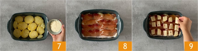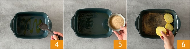 Unte o fundo de uma travessa de 30x20 cm 4, depois polvilhe com farinha de rosca 5. Disponha as fatias de batata formando uma camada compacta 6.