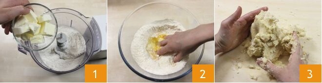 Para preparar a torta de batata-doce, comece pelo preparo da massa: coloque no processador a farinha, uma pitada de sal e a manteiga recém-tirada da geladeira em cubos 1. Bata tudo até obter uma mistura com aparência de areia, adicione o açúcar, as raspas de limão para aromatizar a massa. Em seguida, adicione as gemas 2 e misture rapidamente tudo 3 até obter uma massa compacta e bastante elástica.
