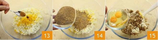 e a canela 13. Junte também o cacau 14, o açúcar mascavo e os ovos inteiros 15
