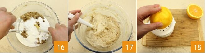 e o creme de leite fresco 16, misture com uma espátula para incorporar os ingredientes 17, esprema o suco da laranja 18,