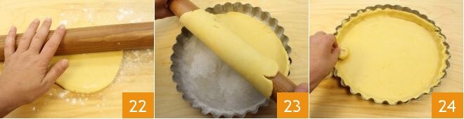 Retire a massa da geladeira, abra-a com o rolo em uma superfície ligeiramente enfarinhada 22, você deve obter uma massa redonda com 1 cm de espessura que seja mais larga que a forma de modo que cubra as bordas do molde. Neste ponto, enrole a massa no rolo e desenrole-a sobre o molde 23, dessa forma, você evitará que a massa quebre. Faça a massa aderir à base e às bordas ajudando-se com um pedaço de massa enrolado no filme plástico 24.