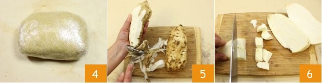 Forme com a massa obtida uma bola, envolva-a com filme plástico 4 e coloque tudo para descansar na geladeira por pelo menos meia hora. Cuide do recheio: descasque as batatas 5, corte-as em cubos 6