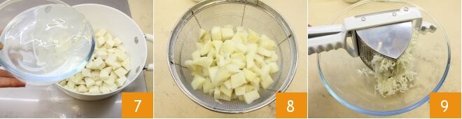 cozinhe em uma panela cheia de água 7 por cerca de 15-20 minutos, até ficarem macias, faça o teste espetando-as com o garfo. Escorra-as 8 e reduza-as a um purê com o espremedor de batatas 9, recolha o purê em uma tigela,