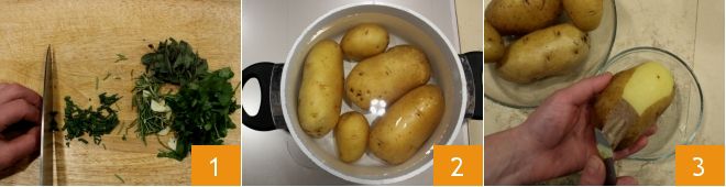 Para preparar a torta de batata, comece picando finamente as ervas aromáticas e o dente de alho descascado 1. Em seguida, lave as batatas em água corrente, esfregando com as mãos para remover a sujeira. Coloque as batatas para cozinhar em uma panela 2 por cerca de 20 minutos ou até que consiga perfurá-las com os dentes de um garfo. Quando estiverem prontas, escorra-as e descasque-as com uma faquinha 3: para não se queimar, você pode ajudar-se com papel de cozinha.