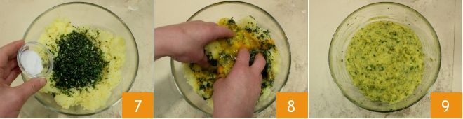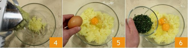 Depois, amasse as batatas com um espremedor e coloque-as em uma tigela 4. Adicione os ovos às batatas 5, todas as ervas que você tinha picado anteriormente 6,