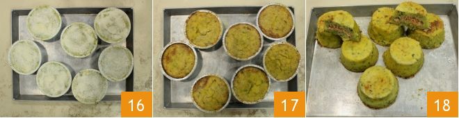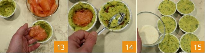 regue cada torta com um fio de azeite de oliva 16. Asse em forno pré-aquecido a 180°C por 40 minutos (35 minutos a 160°C para forno ventilado). Quando estiverem cozidas e bem douradas na superfície 17, deixe as tortas esfriarem um pouco e então desenforme-as virando-as de cabeça para baixo 18. Assim você terá sua torta de batata com um delicioso coração de salmão para servir como entrada ou acompanhamento delicioso!
