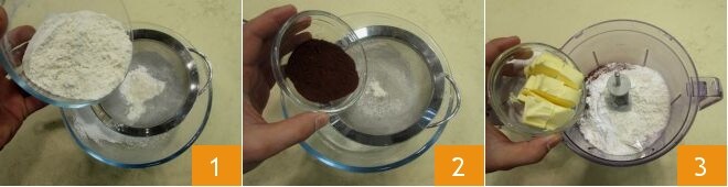 Para preparar a torta de cacau com creme de ricota e chocolate, comece pela massa de cacau; peneire a farinha 1, o cacau em pó 2 e o açúcar de confeiteiro, depois despeje os pós em um processador junto com a manteiga fria cortada em pedaços 3. Bata tudo até obter uma mistura arenosa e farinhenta,