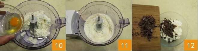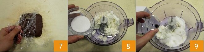 Forme um bloco, envolva-o em filme plástico 7, depois deixe descansar na geladeira por 30 minutos. Enquanto isso, prepare o creme de ricota e chocolate: coloque em um processador equipado com lâminas a ricota, o açúcar granulado 8 e as sementes de uma fava de baunilha 9.