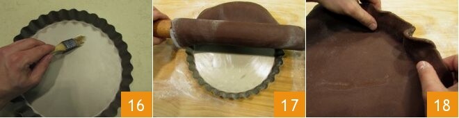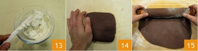 misture com uma espátula 13, cubra com filme plástico e coloque na geladeira. Após o tempo necessário 14, estenda a massa de cacau com o rolo, usando a menor quantidade possível de farinha, a uma espessura de 6-7 mm formando um círculo 15.