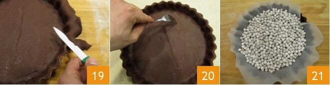 Corte as partes de massa em excesso, mantendo a borda alta de pelo menos 2 cm: coloque de lado e recompense as sobras, que serão usadas para a decoração final 19. Fure o fundo com os dentes de um garfo 20 e cubra com uma folha de papel manteiga que você preencherá com leguminosas secas ou esferas de porcelana para o cozimento às cegas 21. Asse em forno estático pré-aquecido a 175°C por 20 minutos (ou a 155°C por 12 minutos se em forno ventilado). Decorrido esse tempo, remova as esferas de cerâmica (ou as leguminosas) e o papel manteiga e deixe assar por mais 5 minutos na mesma temperatura. Uma vez pronta, retire do forno e deixe esfriar.