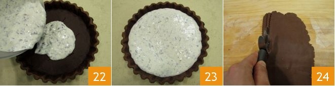 Despeje o creme de ricota dentro da massa já fria 22 (você também pode colocar o recheio em um saco de confeitar sem bico, fazendo um furo) e nivelar o recheio com uma colher 23. Estenda a massa restante sobre a superfície de trabalho levemente enfarinhada e obtenha tiras largas de 6 mm e espessura de 2-3 mm com uma roda dentada 24.