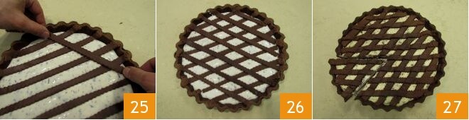 Coloque as tiras de massa sobre o creme de ricota de forma oblíqua 25 para formar losangos 26. Asse novamente em forno estático pré-aquecido a 175°C por 10-15 minutos (ou a 155°C por 8-10 minutos se em forno ventilado). Uma vez pronta, deixe esfriar completamente; por fim, você poderá servir a sua torta de cacau com creme de ricota e chocolate 27.