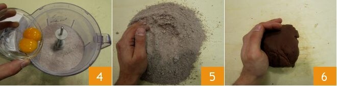 depois adicione as gemas 4 e continue a bater. Transfira a massa (que ainda estará farinhenta e não incorporada) para uma superfície de trabalho 5 e amasse energicamente com as mãos até obter uma massa bastante compacta e lisa 6.