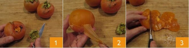 Para preparar o bolo de caqui, lave as frutas, corte o pedúnculo 1 e retire a casca 2, fatie grosseiramente 3 e reserve.